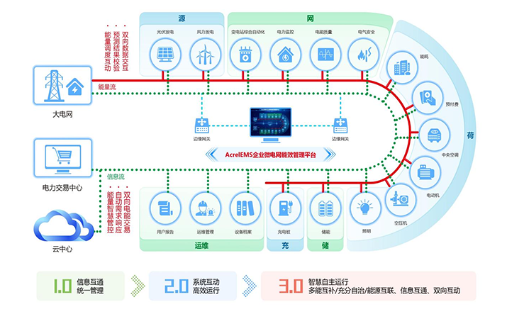 簡介:1.概述 通過在源、網、荷、儲、充的各個關鍵節(jié)點安裝監(jiān)測、分析、保護、治理裝置, 通過高性能邊緣計算網關采集數(shù)據并上傳至企業(yè)微網平臺。平臺根據新的電網價格、 用電負荷、電網調度指令等情況,調整各系統(tǒng)控制策略并遠程下發(fā),使企業(yè)微電網始終高效穩(wěn)定運行, 降低企業(yè)用電成本,實現(xiàn)能源互聯(lián)、信息互動。 2.應用場所 適用于各行業(yè)企業(yè)內部微電網管理系統(tǒng)的新建、擴建、改建等項目。 3.平臺結構 3.平臺功能 安科瑞AcrelEMS企業(yè)微電網能效管理平臺融合了電力監(jiān)控、電氣安全、照明控制、能源管控、充電樁運營管理、分布式光伏監(jiān)測、儲能管理、設備臺賬、運維管理等功能,通過一個平臺、一個APP整體的對企業(yè)用電進行集中監(jiān)控、統(tǒng)一調度、統(tǒng)一運維,并且根據當?shù)毓╇姴块T錯峰避峰計劃提前為企業(yè)制定錯峰避峰方案和預警,滿足企業(yè)